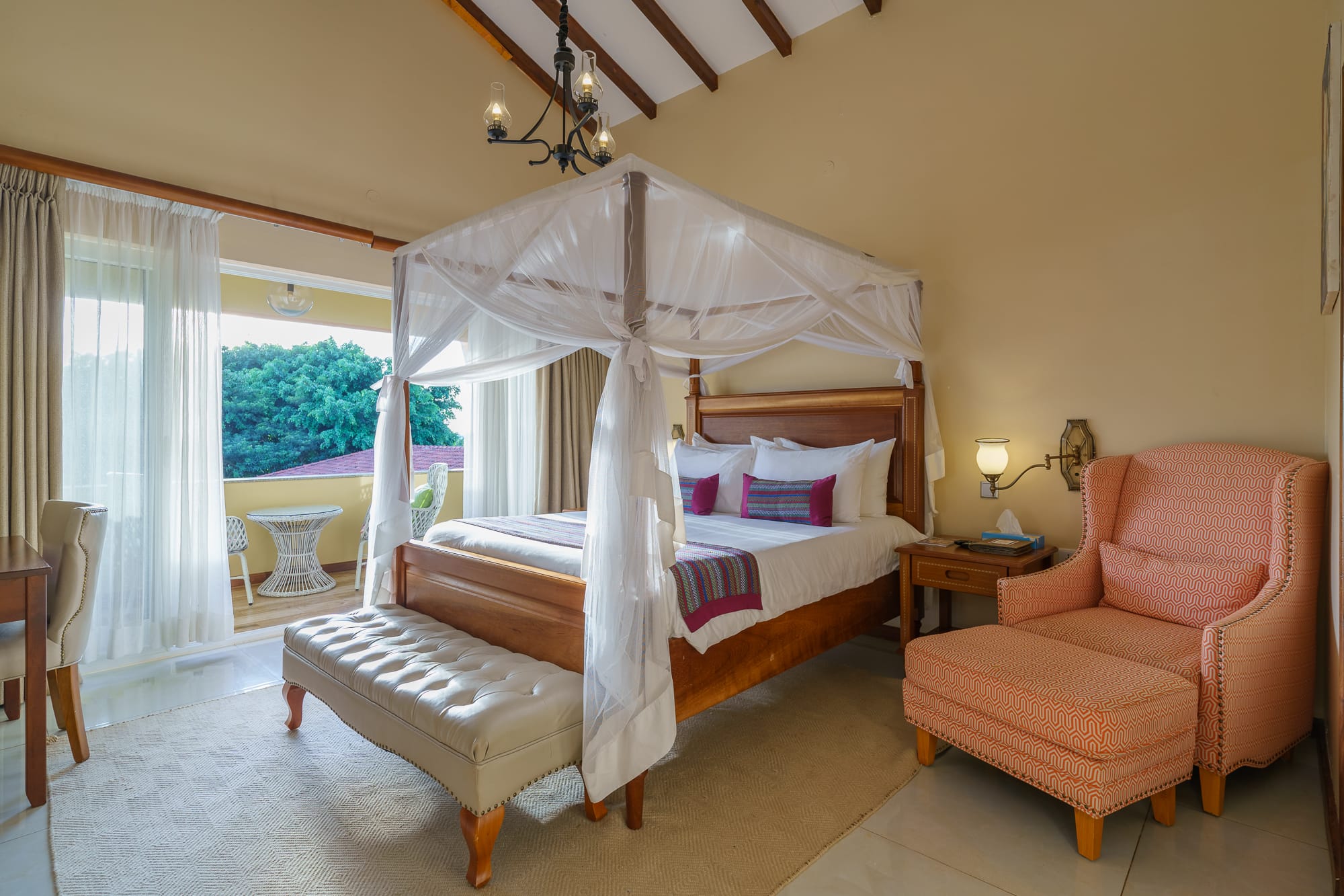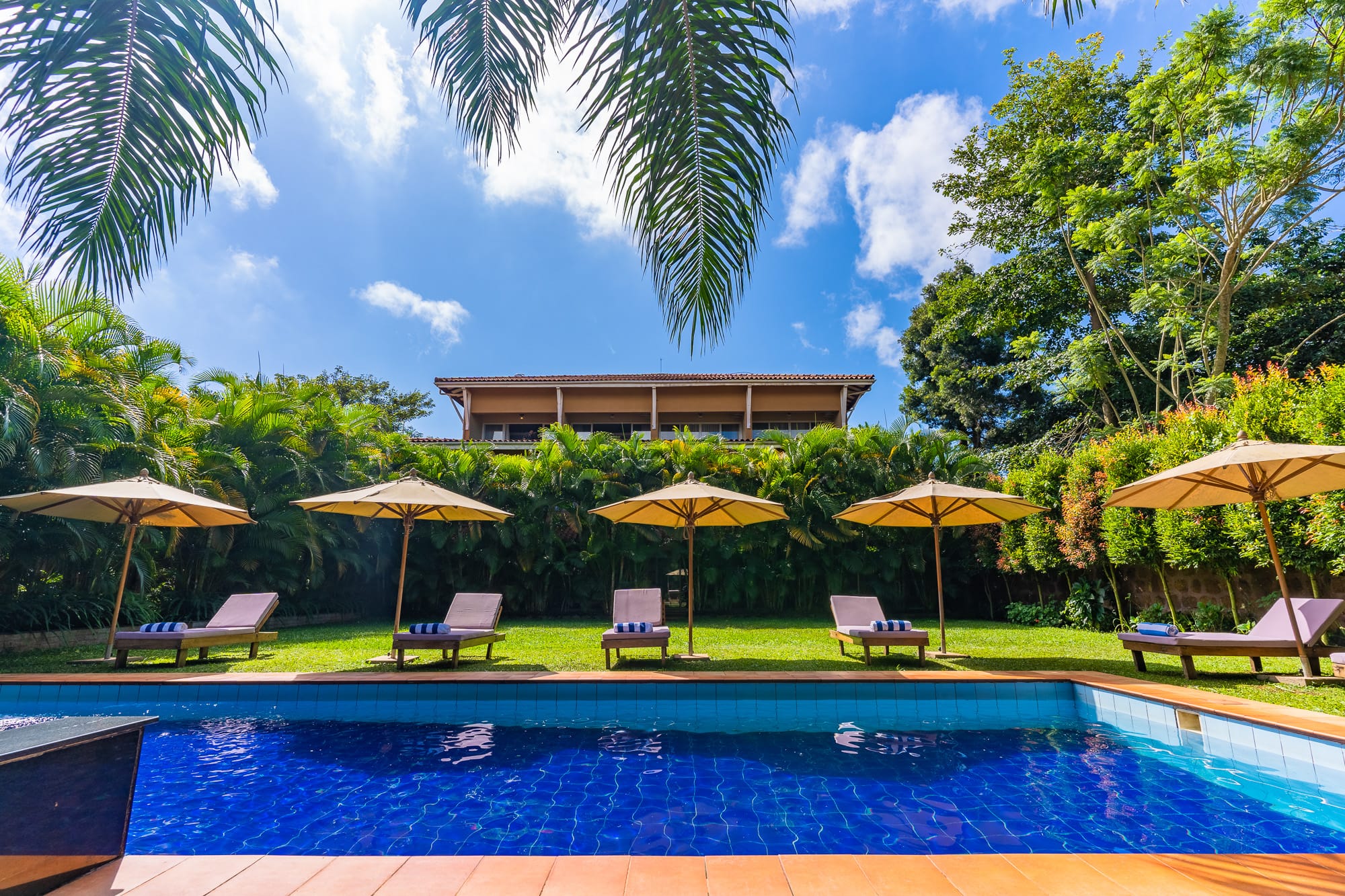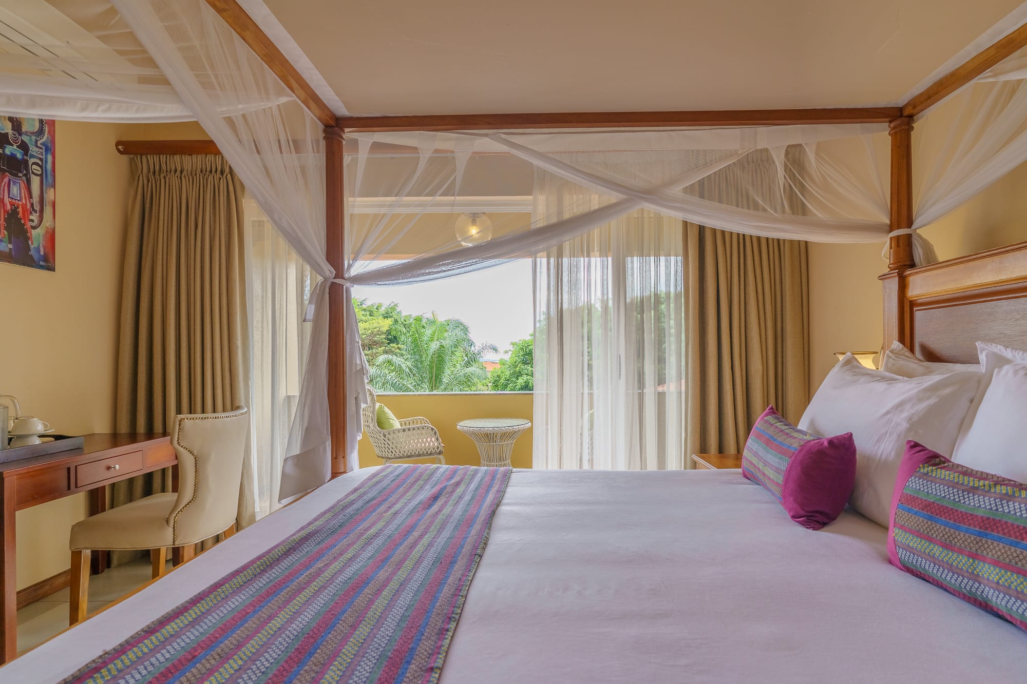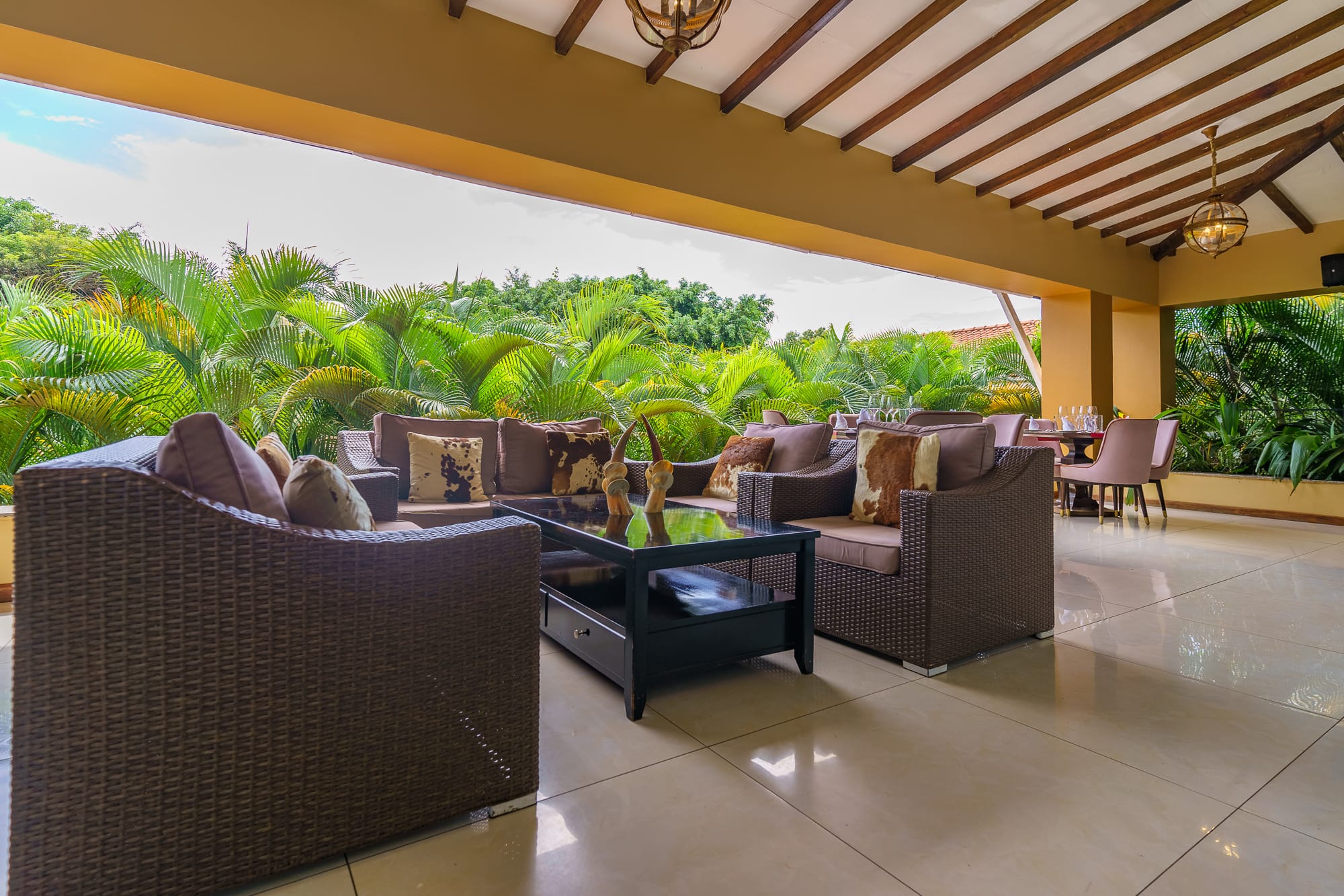 The property blends contemporary design with local craft โ a mix of clean furnishing and Ugandan-made detailing that runs through the rooms, lounge areas, and courtyard. The grounds include mature tropical planting and sightlines toward Lake Victoria and the adjacent botanical gardens.