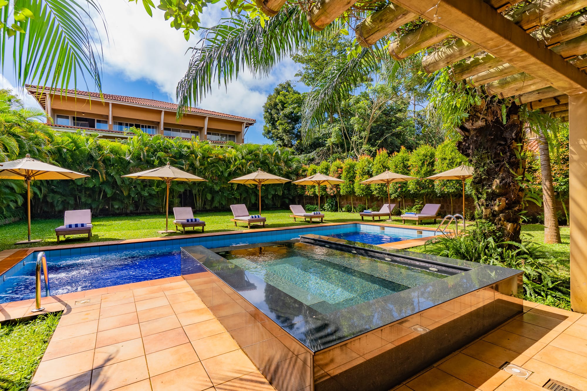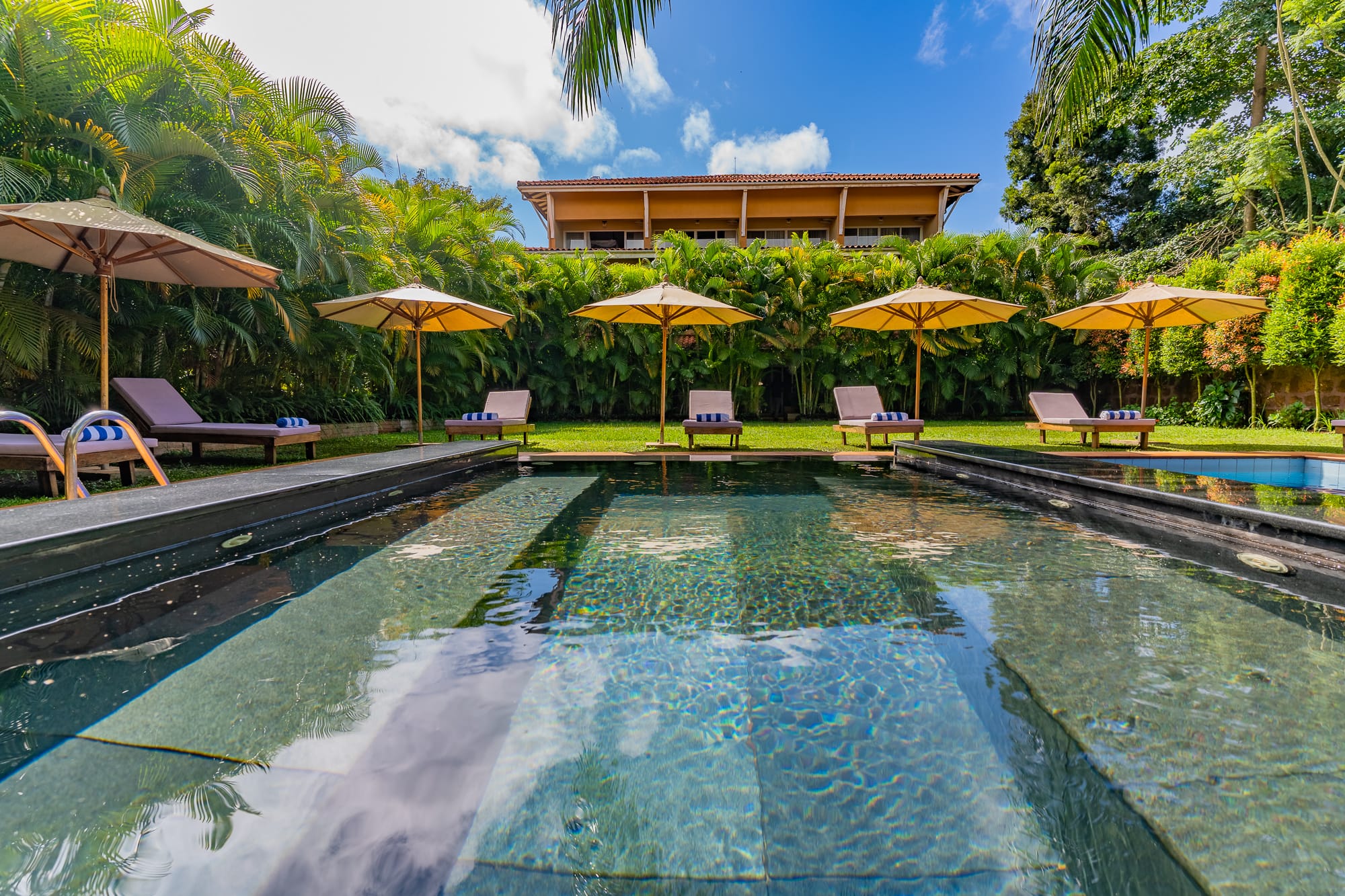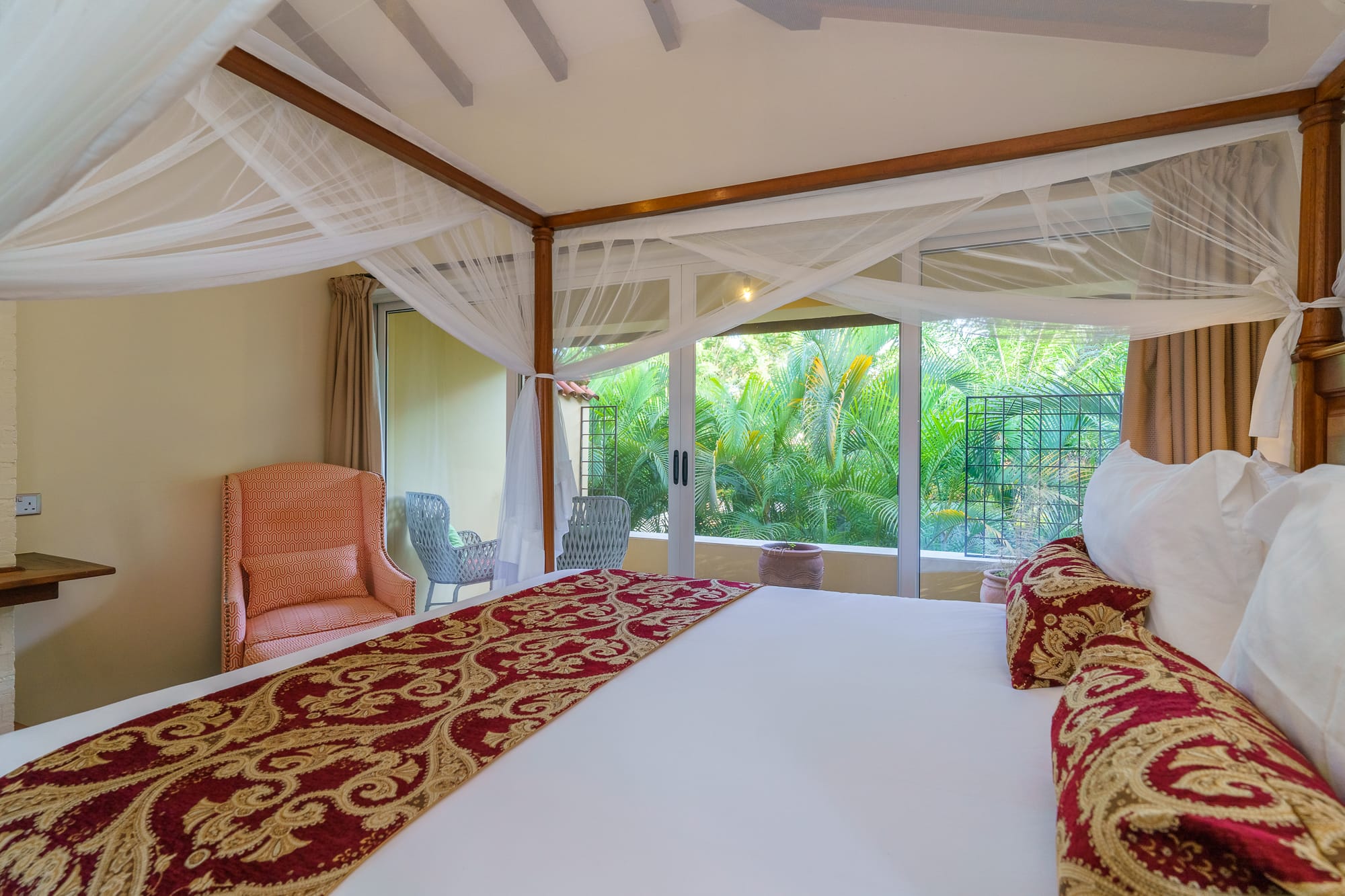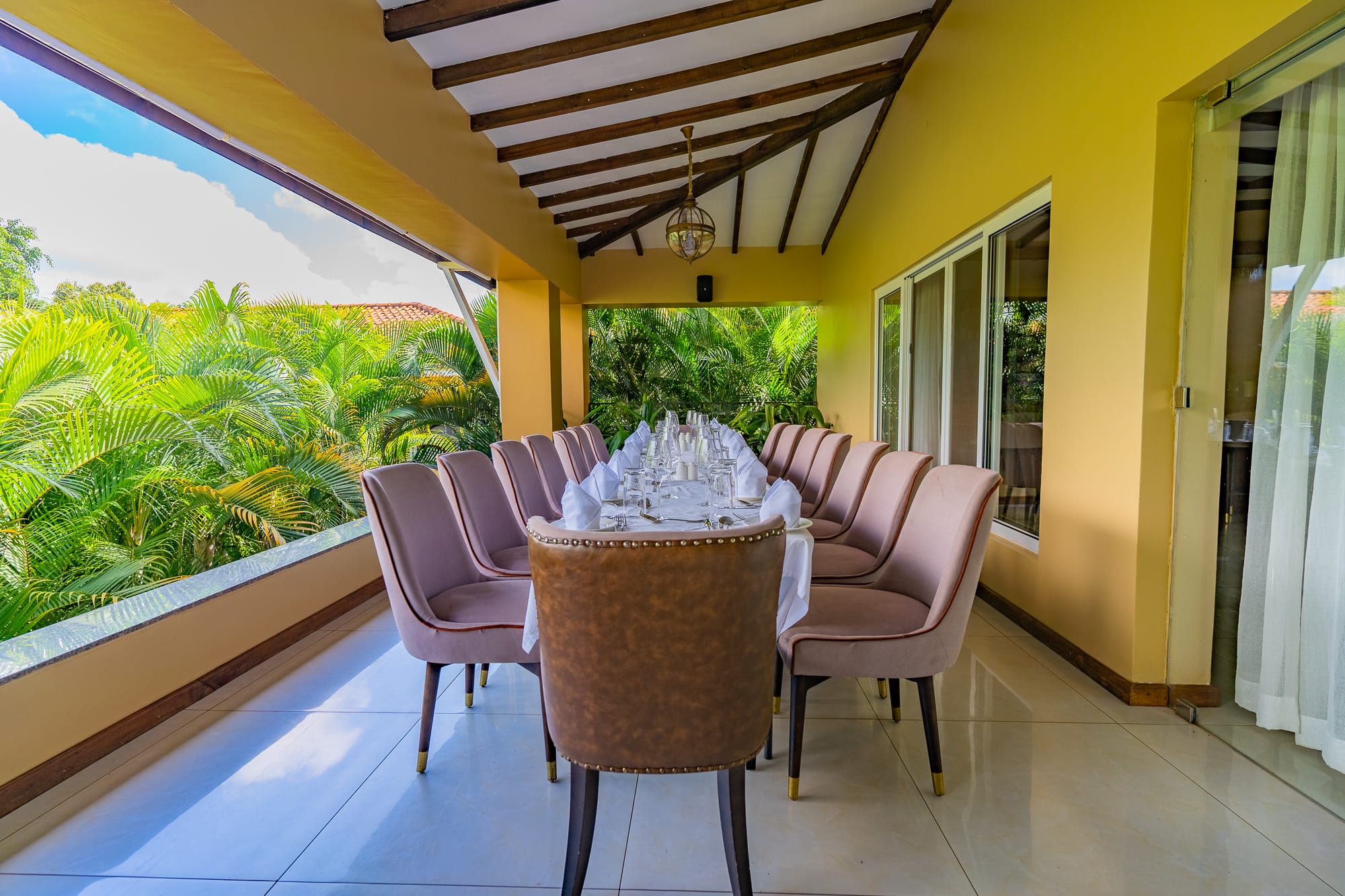 The property blends contemporary design with local craft โ a mix of clean furnishing and Ugandan-made detailing that runs through the rooms, lounge areas, and courtyard. The grounds include mature tropical planting and sightlines toward Lake Victoria and the adjacent botanical gardens.