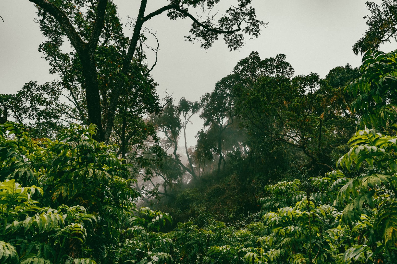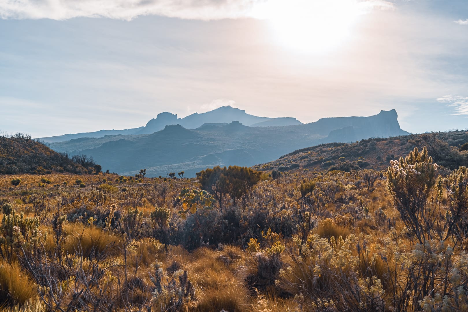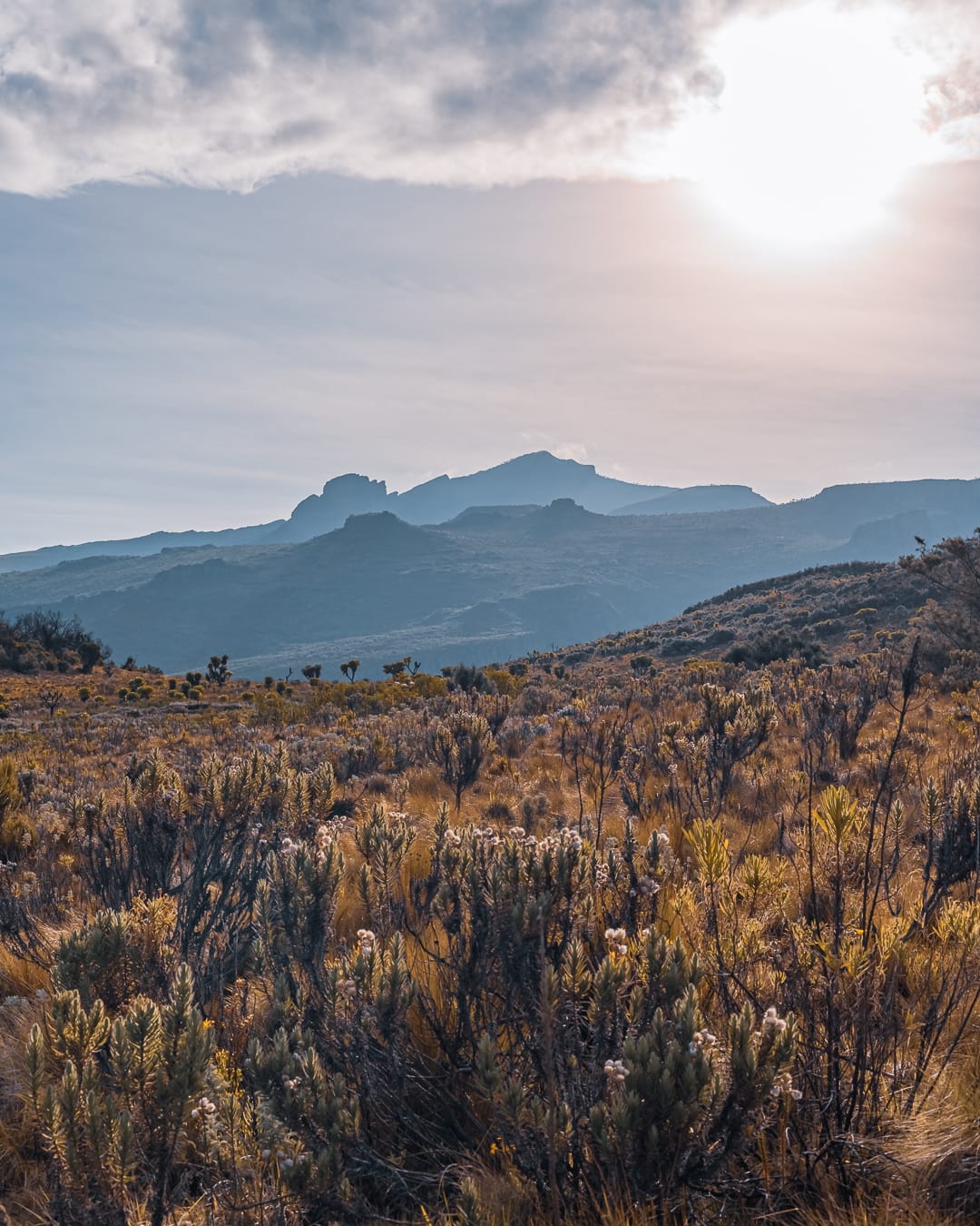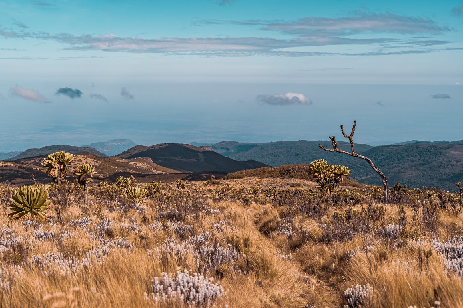 The series covers the mountain's upper slopes, ridgelines, and the broad views across the surrounding lowlands of eastern Uganda. The climate is notably cooler than the plains below, and cloud cover is frequent, producing soft and variable light conditions.