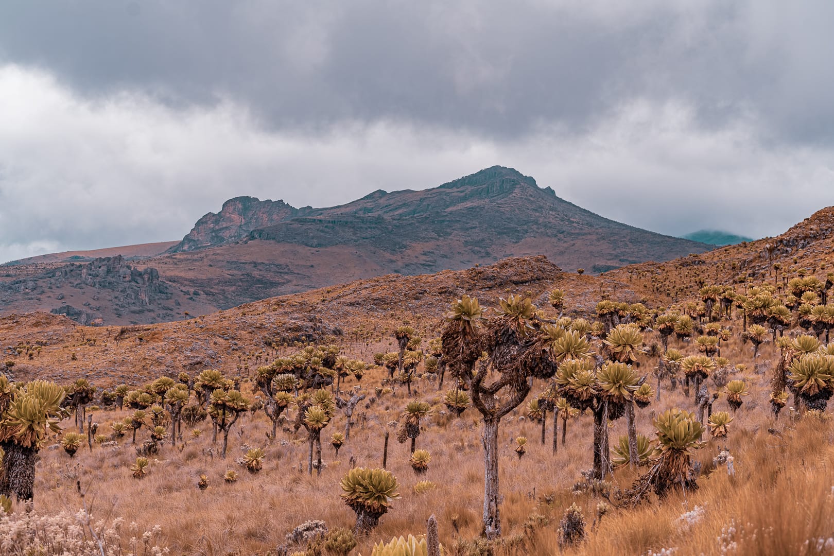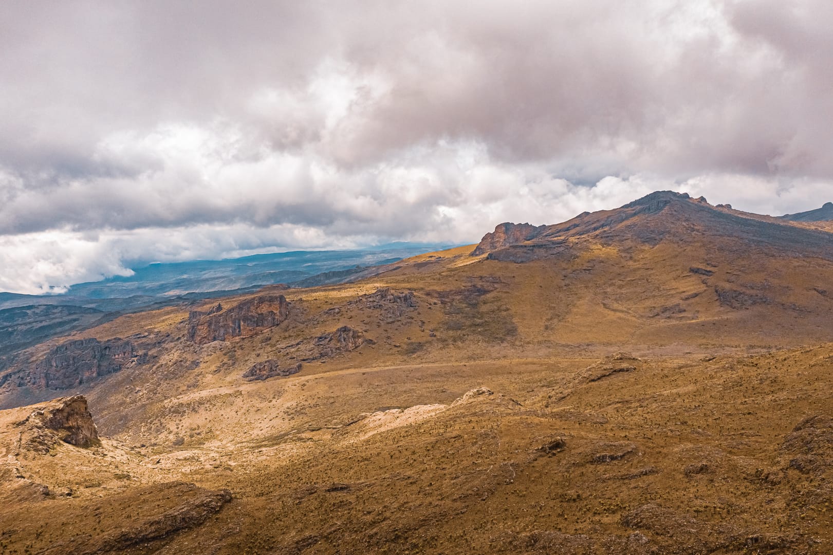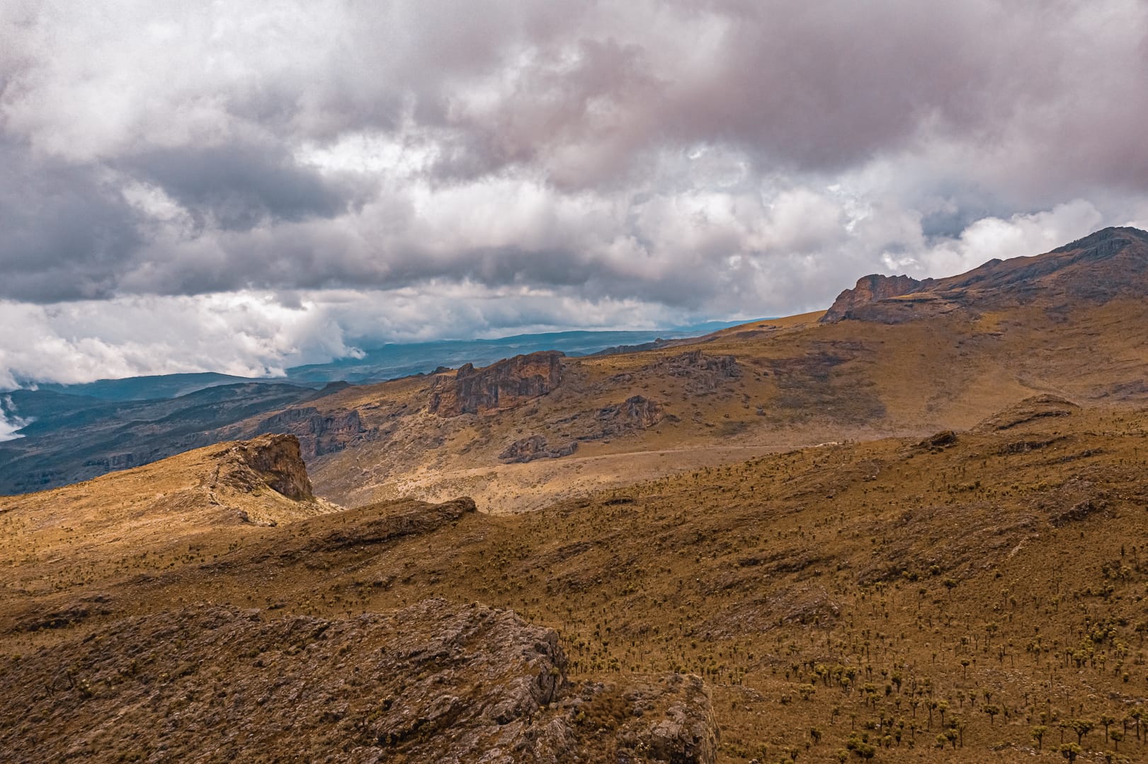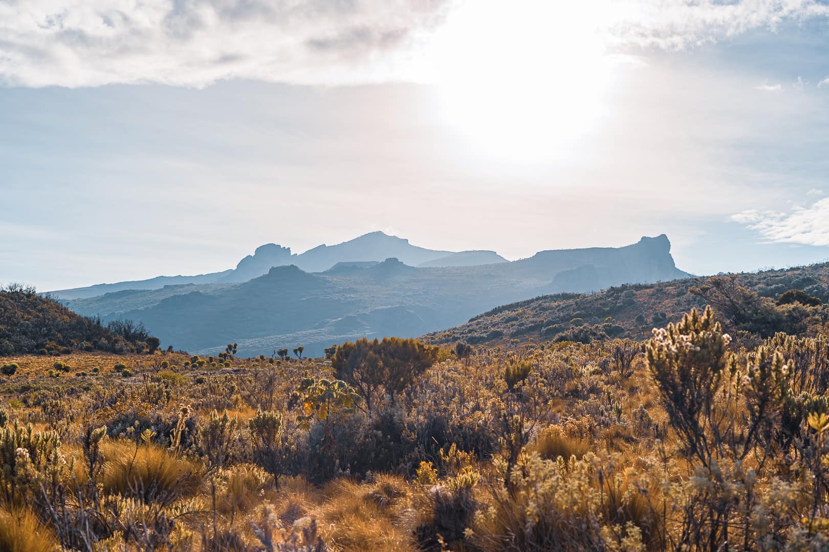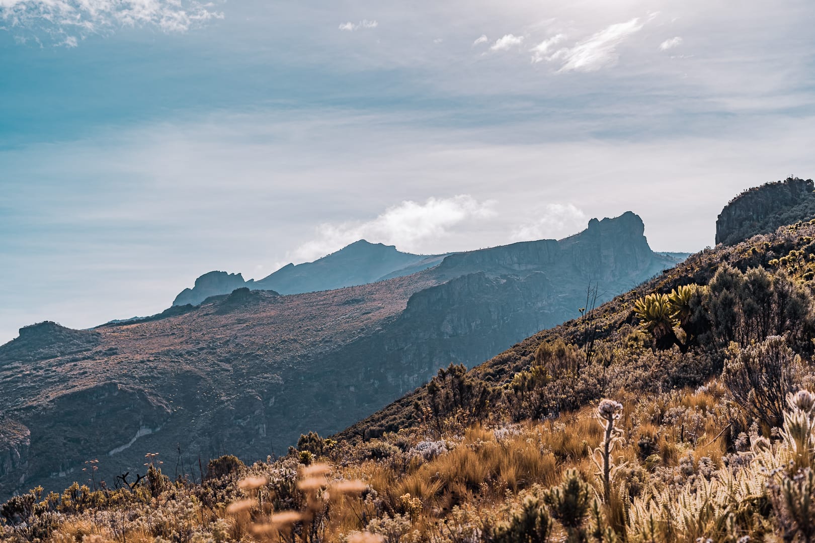 The series covers the mountain's upper slopes, ridgelines, and the broad views across the surrounding lowlands of eastern Uganda. The climate is notably cooler than the plains below, and cloud cover is frequent, producing soft and variable light conditions.