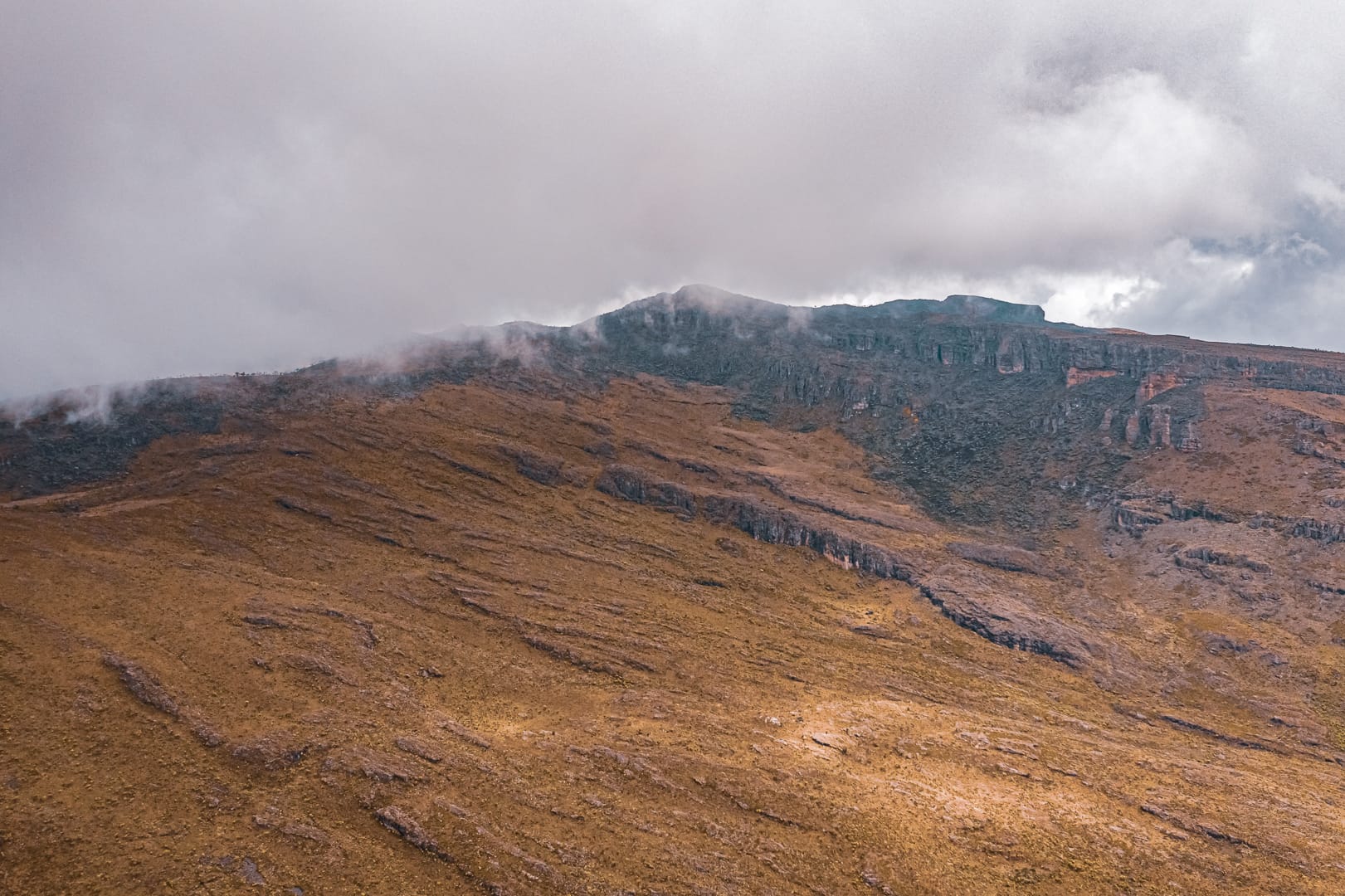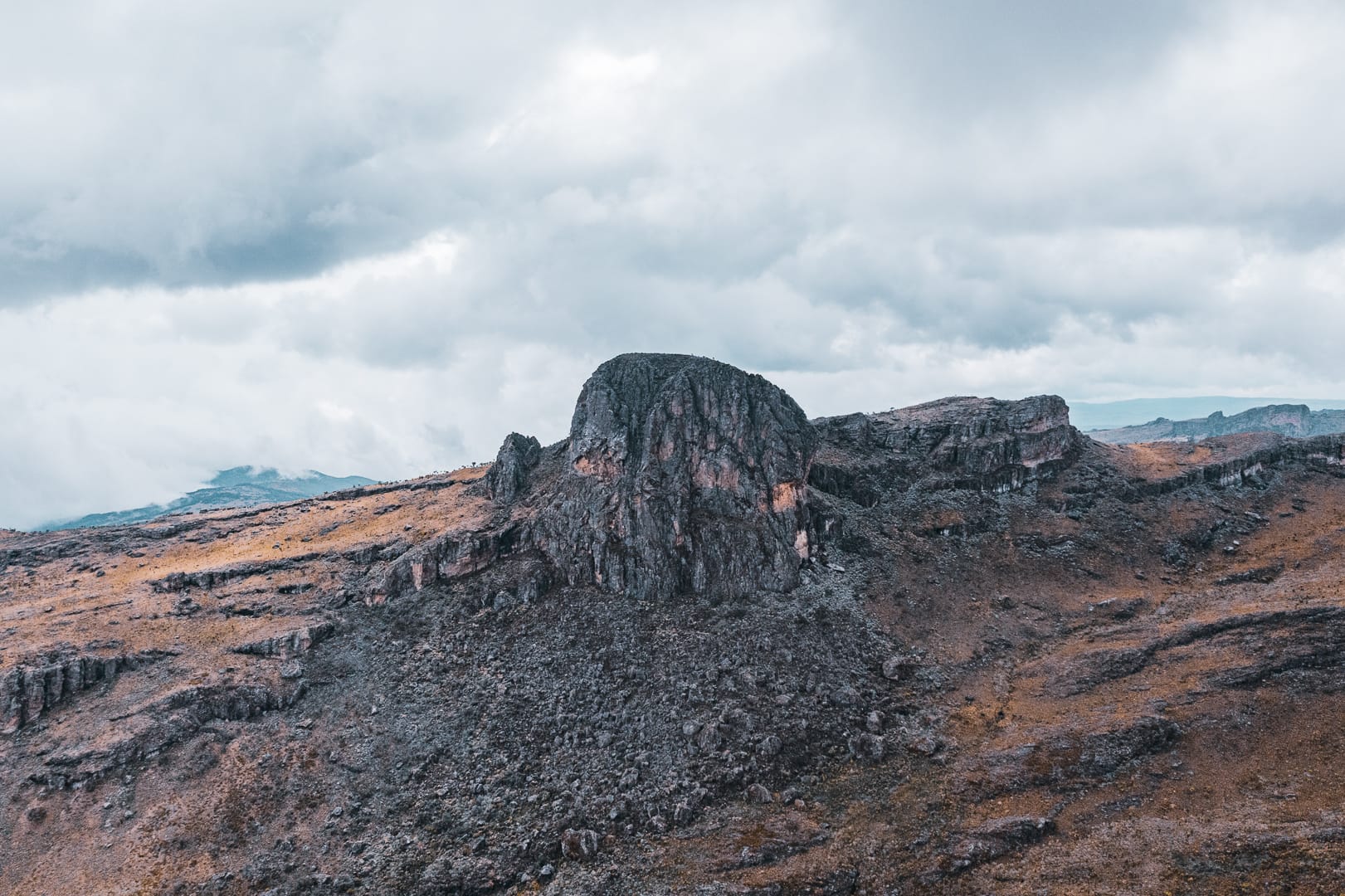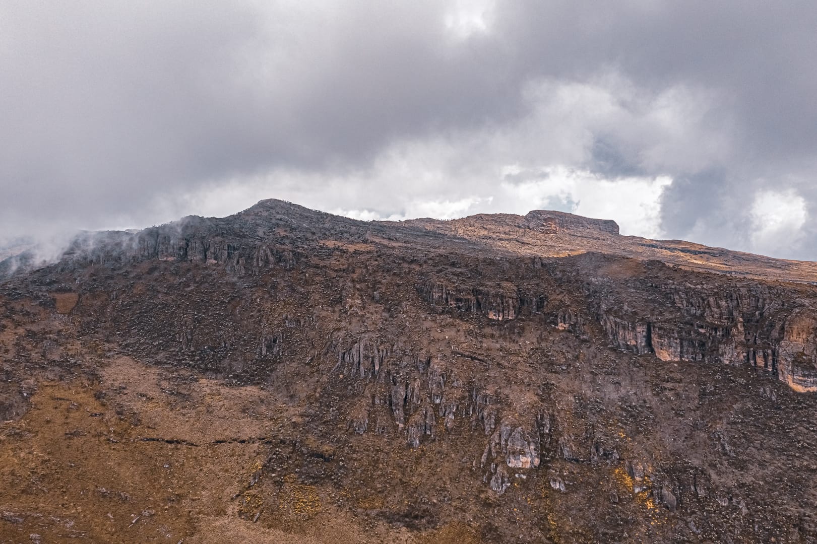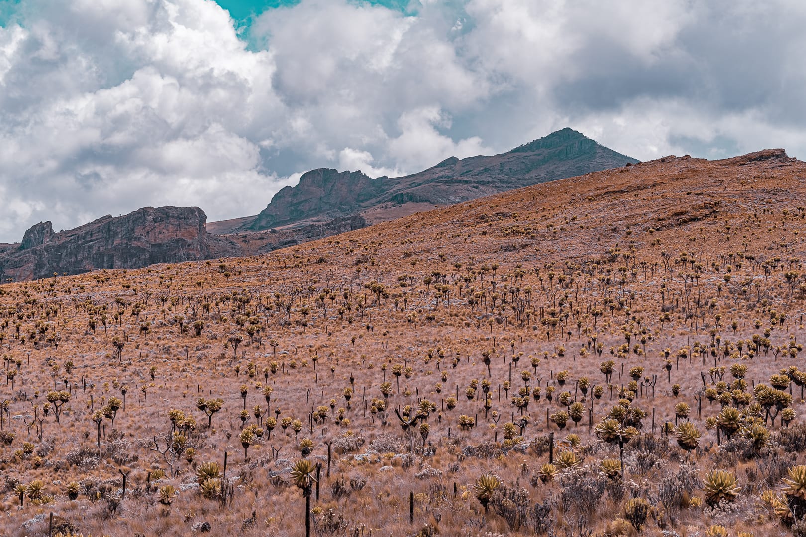 The series covers the mountain's upper slopes, ridgelines, and the broad views across the surrounding lowlands of eastern Uganda. The climate is notably cooler than the plains below, and cloud cover is frequent, producing soft and variable light conditions.