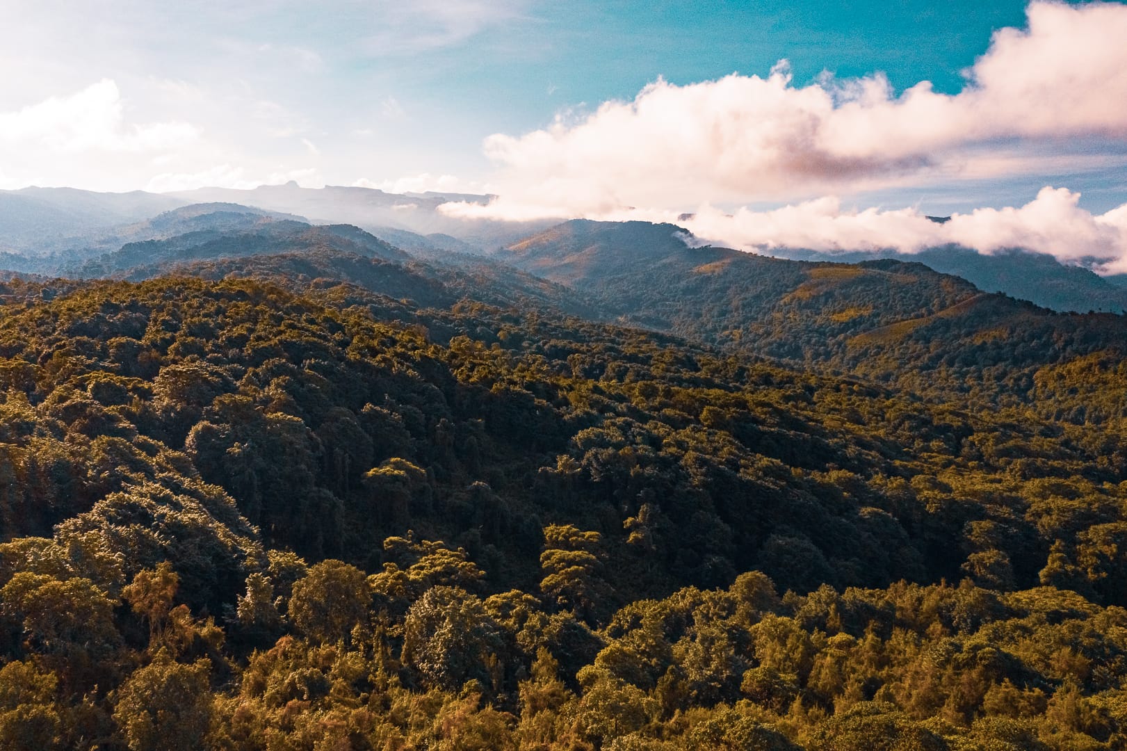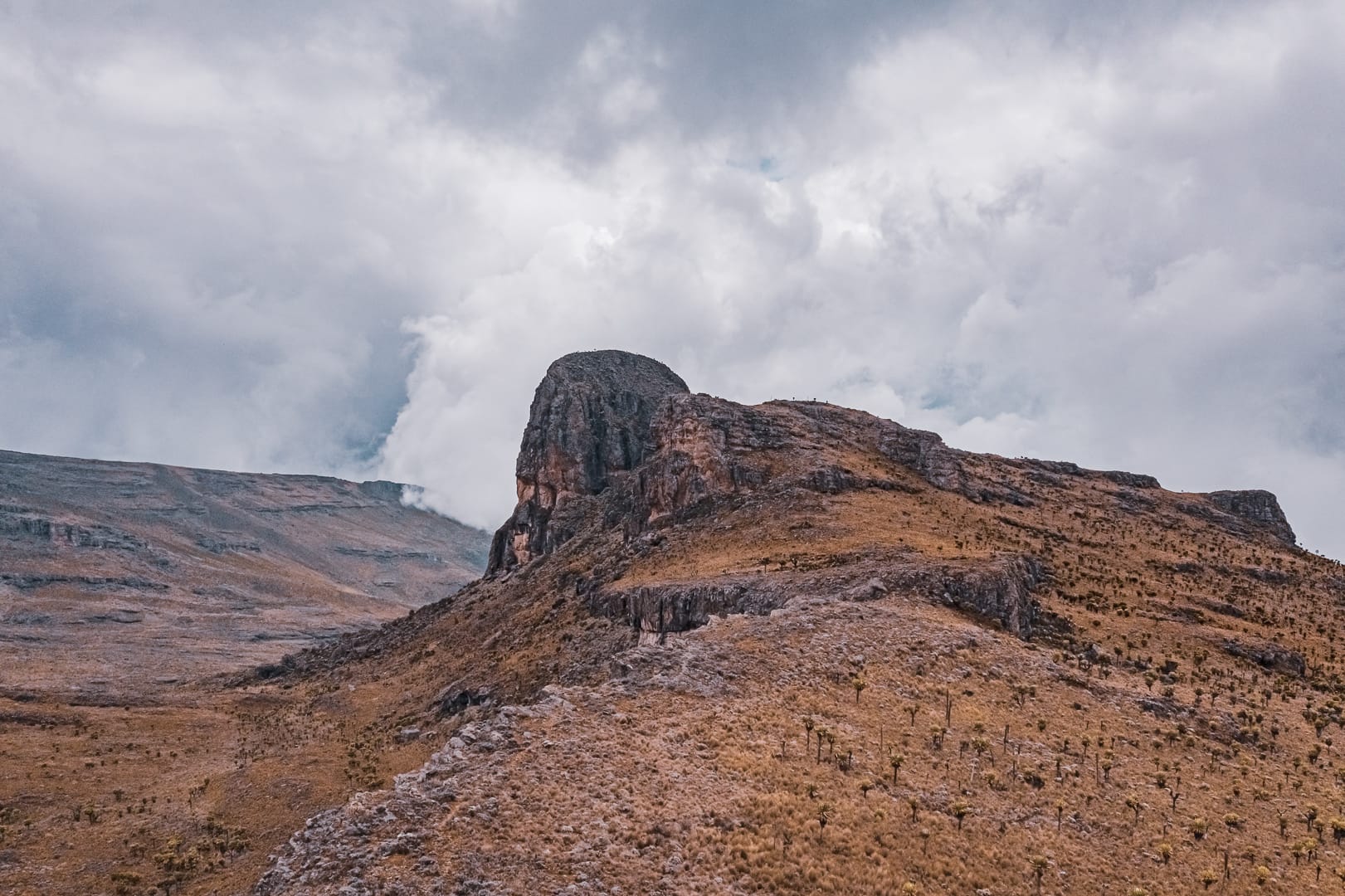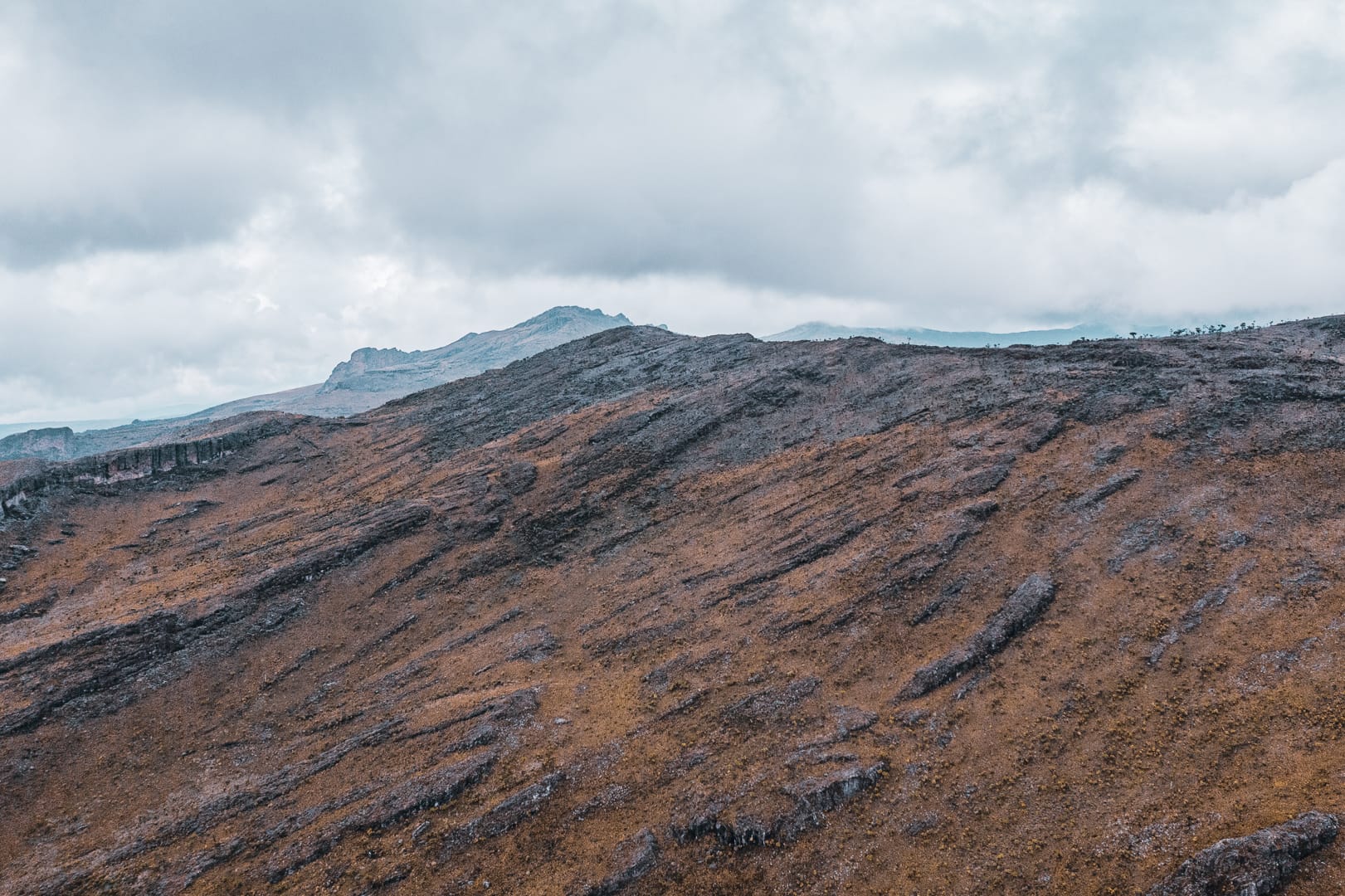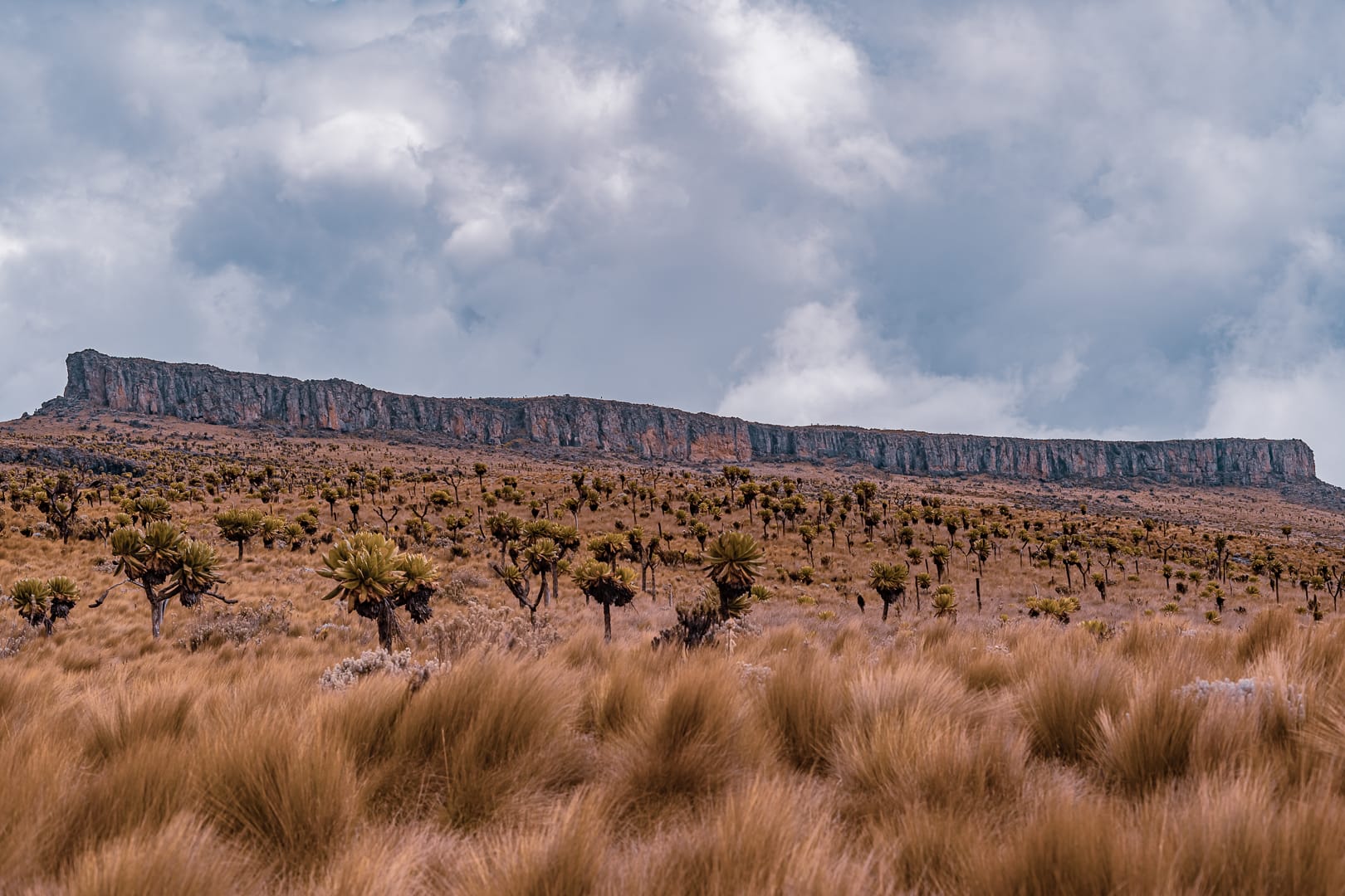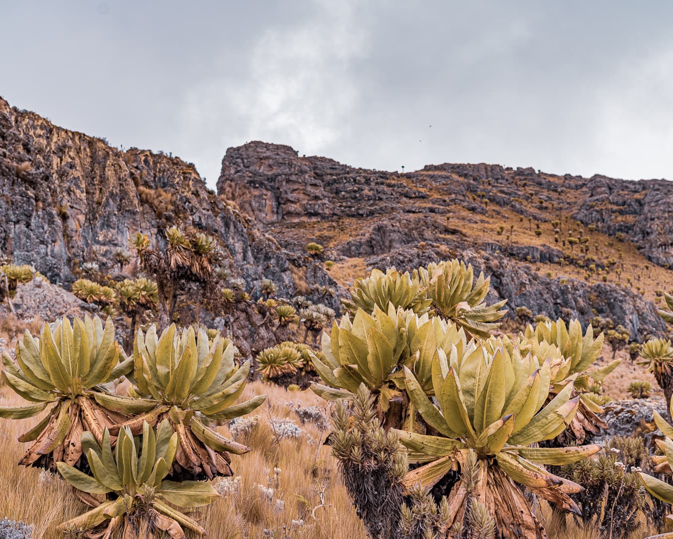 The series covers the mountain's upper slopes, ridgelines, and the broad views across the surrounding lowlands of eastern Uganda. The climate is notably cooler than the plains below, and cloud cover is frequent, producing soft and variable light conditions.