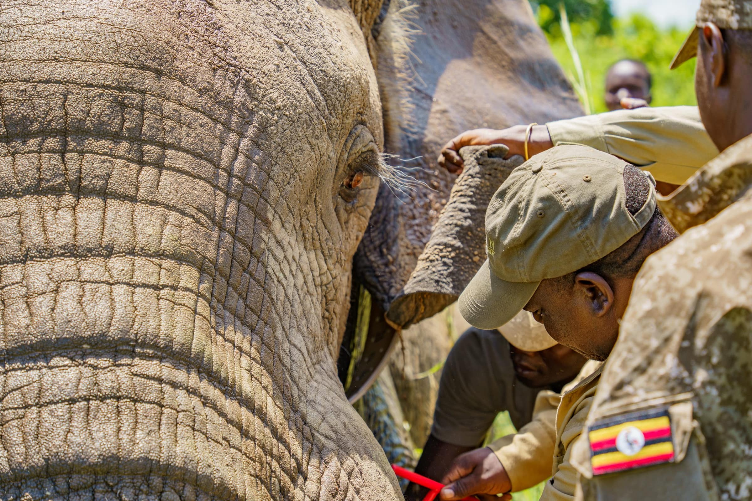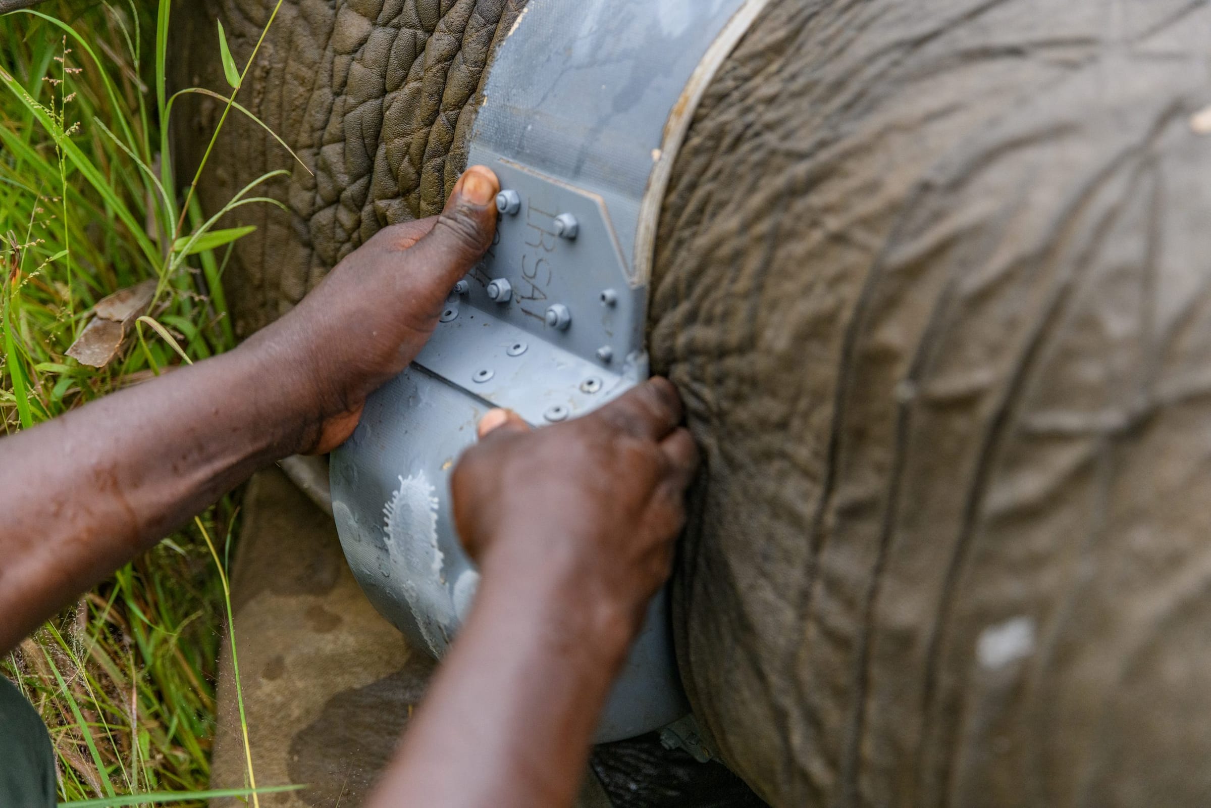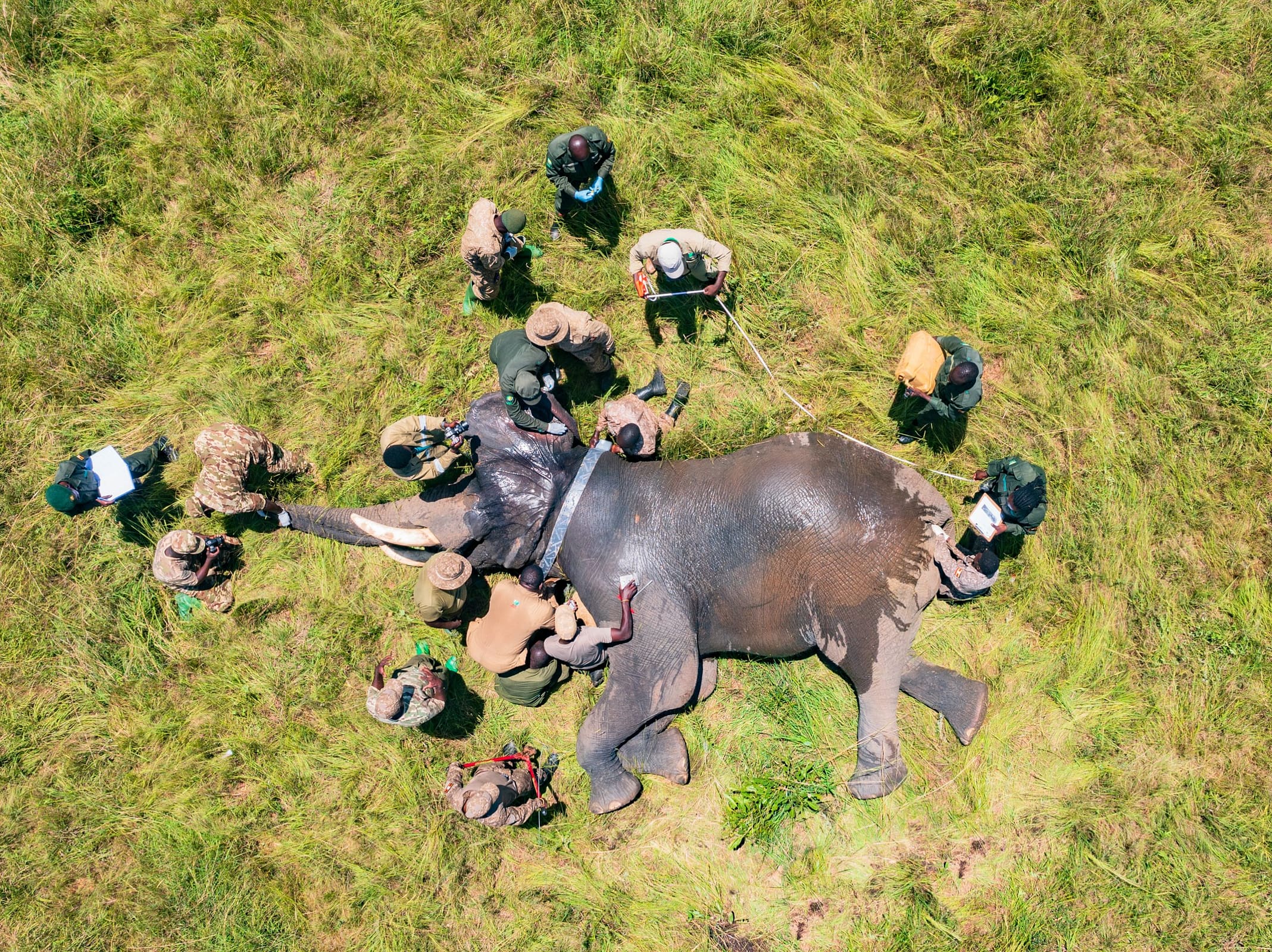 Specimen Monitoring: Procedural photography of elephant collaring operations, including chemical immobilization and the installation of satellite telemetry hardware.
