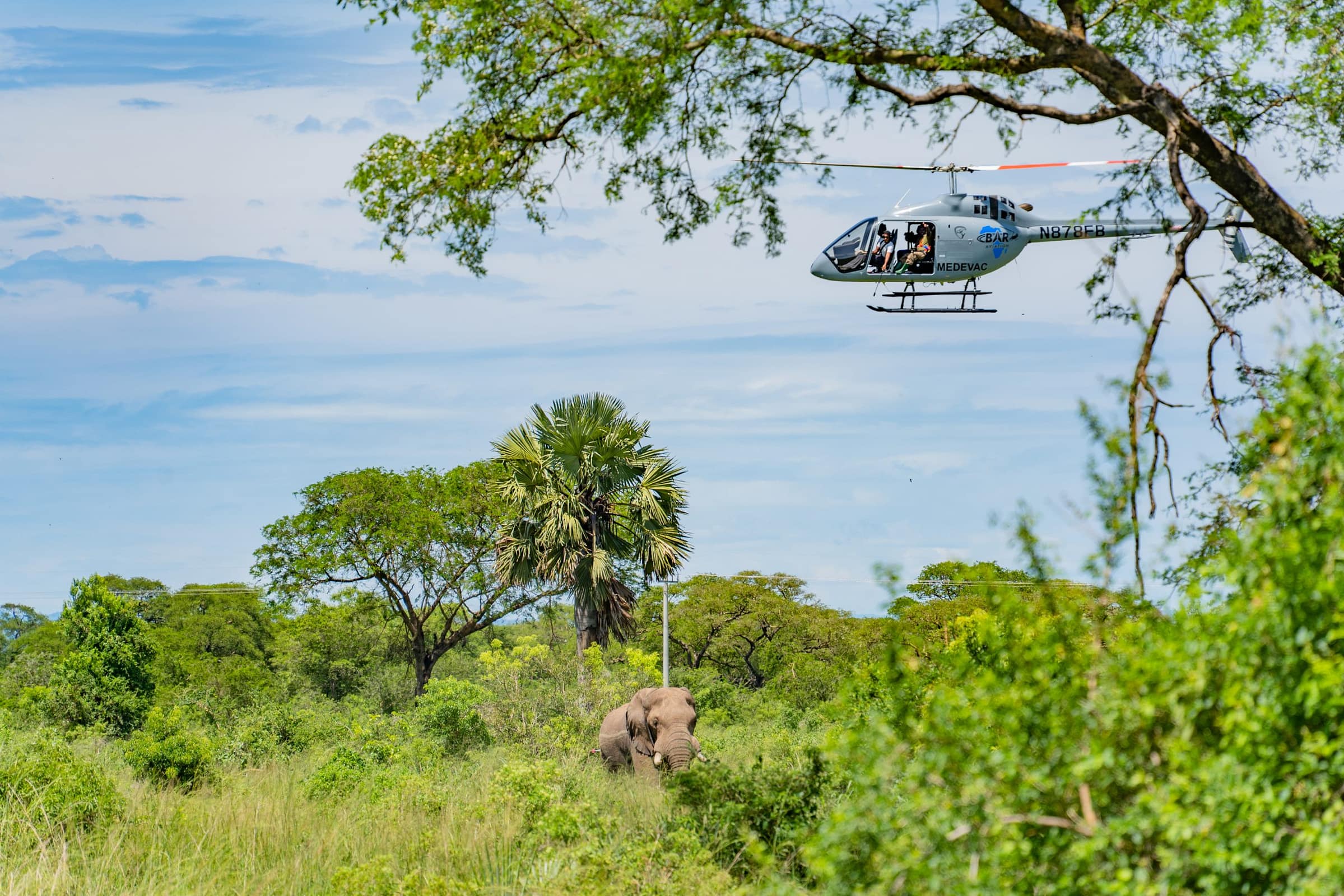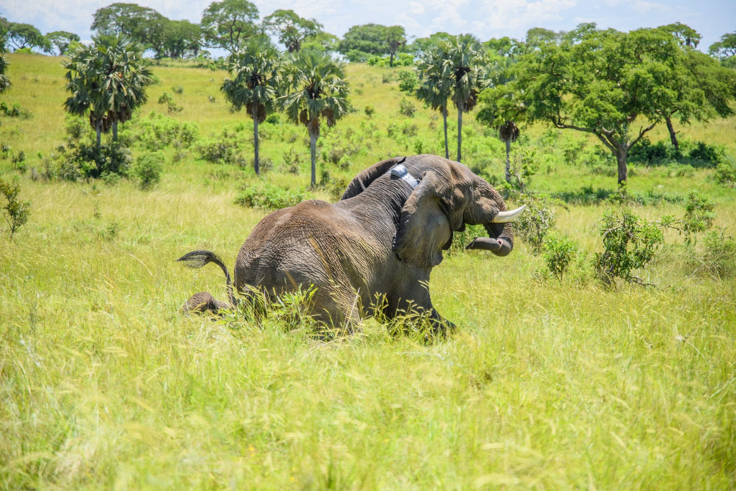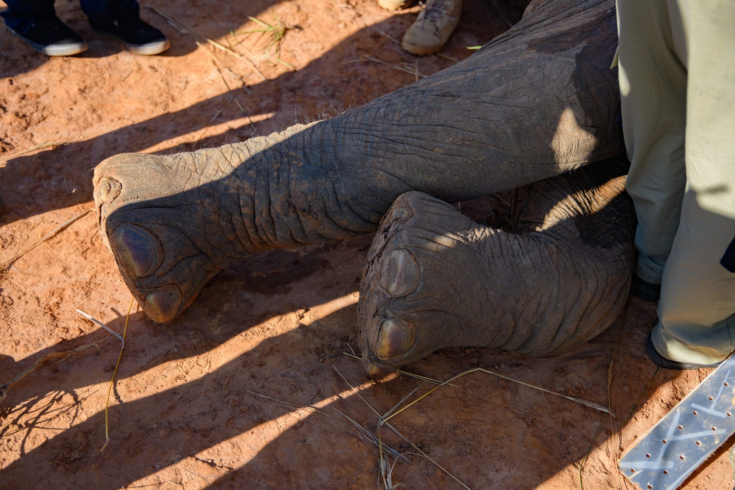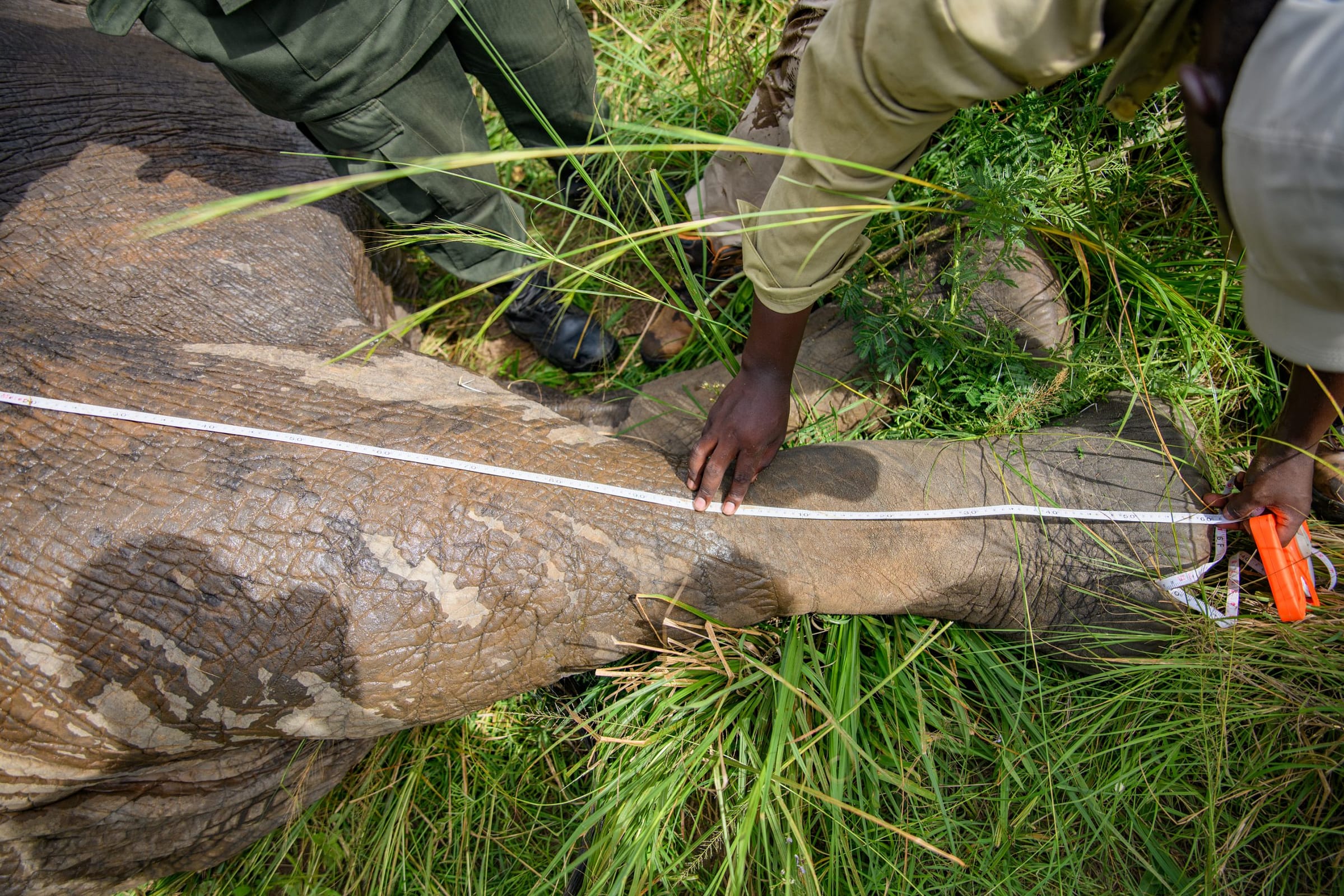Specimen Monitoring: Procedural photography of elephant collaring operations, including chemical immobilization and the installation of satellite telemetry hardware.